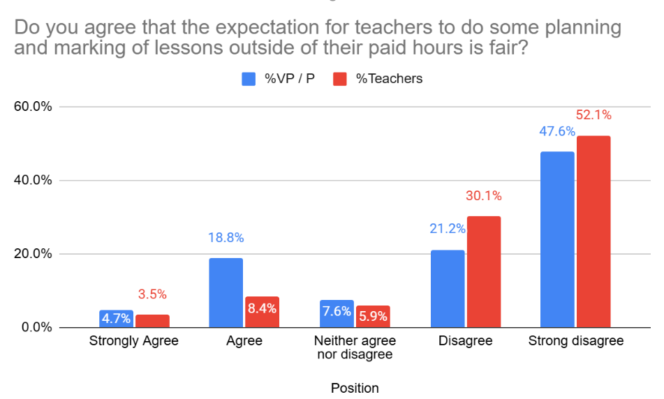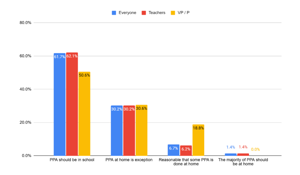 60-odd percent of teachers think PPA should be in our contracted and paid hours, and half of VPs / Ps who responded agreed. Another 30% said that most PPA should be in school hours, with doing it at home being an exception rather than the rule. (This is in line with TNC 2024/2)