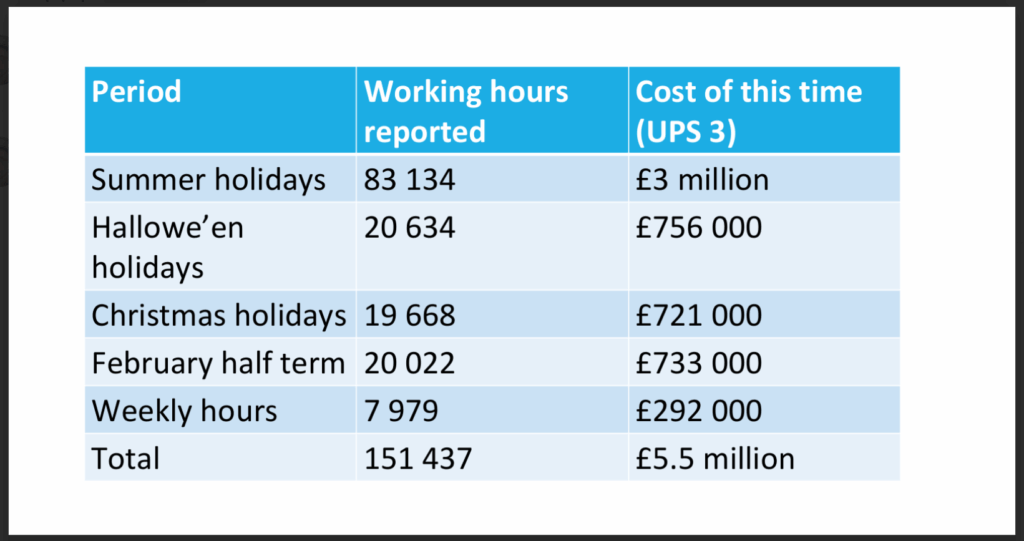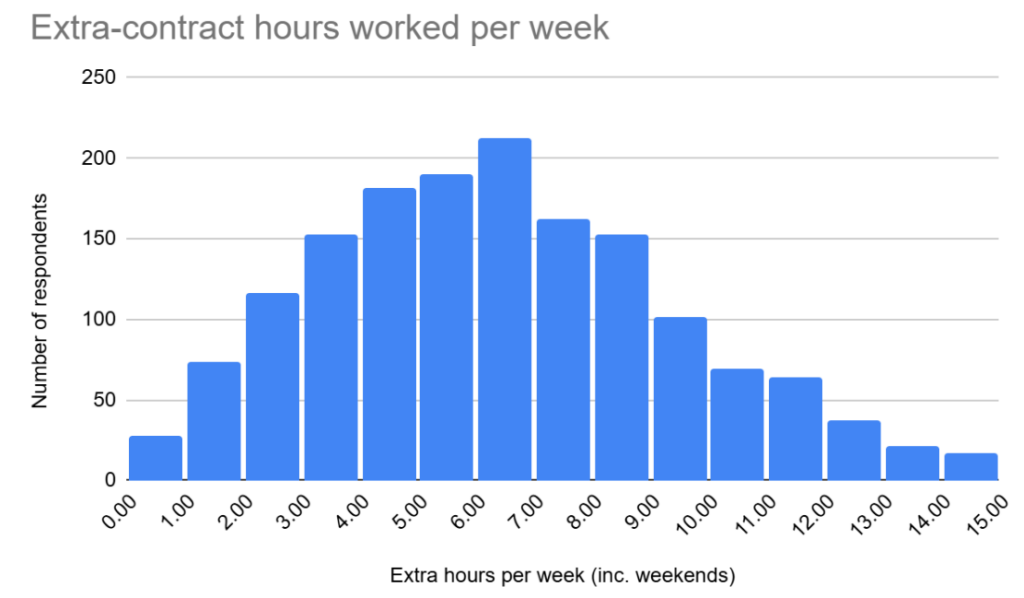 The graphic above shows the actual reported hours of extra work by staff in our survey, multiplied by the UPS3 pay rate to give an hourly amount. Since this was work done over half a school year, we can multiply that amount by two to estimate the total free labour per year: £11 million for 4186 staff. Note – this is likely an underestimate, as for many schools workload increases in April / May as deadlines approach.