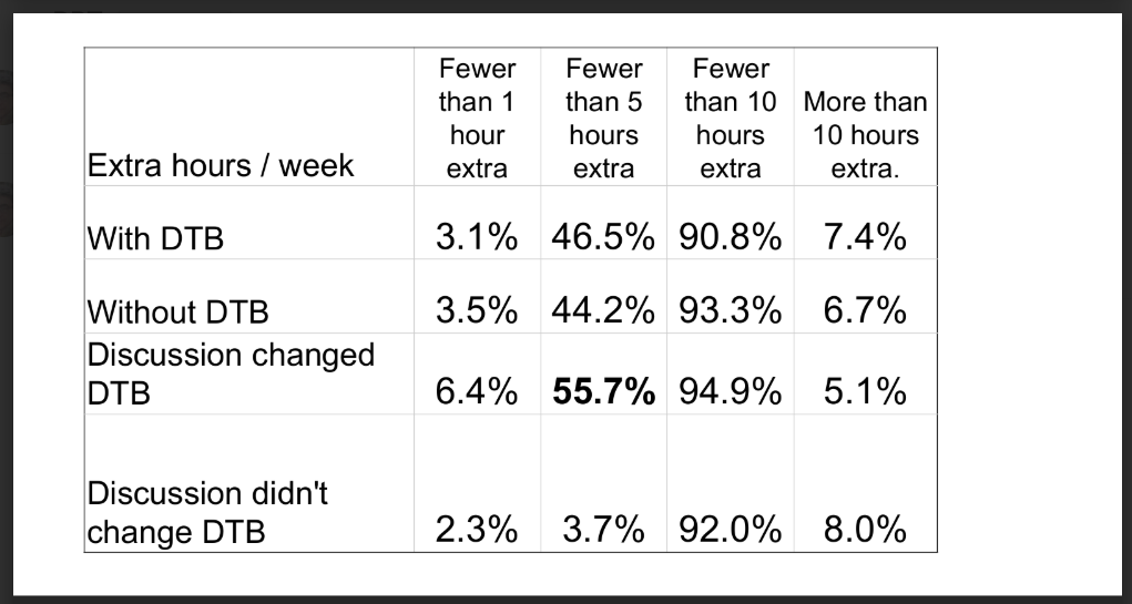 - While time budgets themselves don’t seem to help much at present, a majority of teachers who had a meaningful discussion which resulted in their DTB getting changed to suit their workload, worked fewer extra hours than teachers who were unable to have their DTB tweaked. So communication and discussion about staff needs really makes a difference.