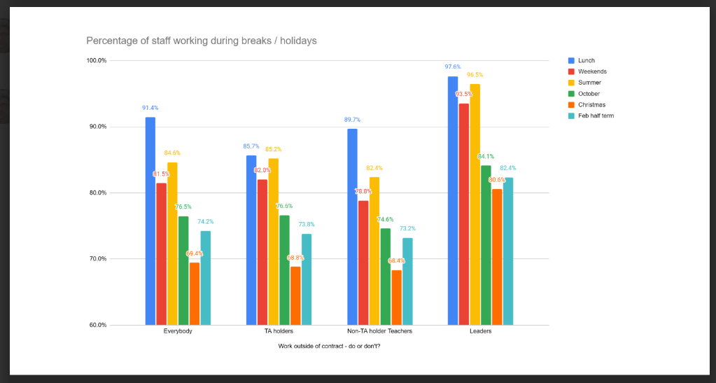 91% of teachers say they work through their unpaid lunch, while almost all school leaders do this.