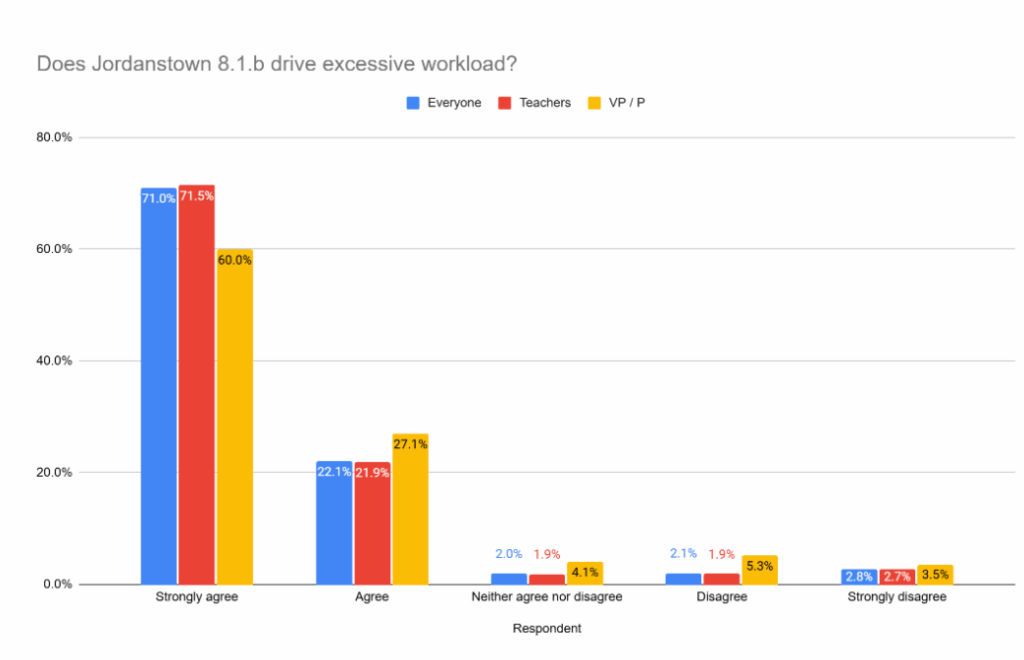 93% of teachers, and almost 80% of VPs and Principals, think that 8.1.b is driving excessive workload. Similar numbers say it is fuelling the recruitment and retention crisis.