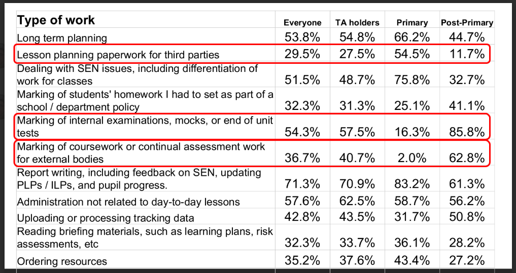 Our survey shows that a good proportion of teacher time outside of school is being spent on these tasks, even though the NITC now considers this type of work “no longer satisfactory”, and the most recent pay offer clarifies that any time spent doing this is entirely at the professional judgement of teachers themselves.